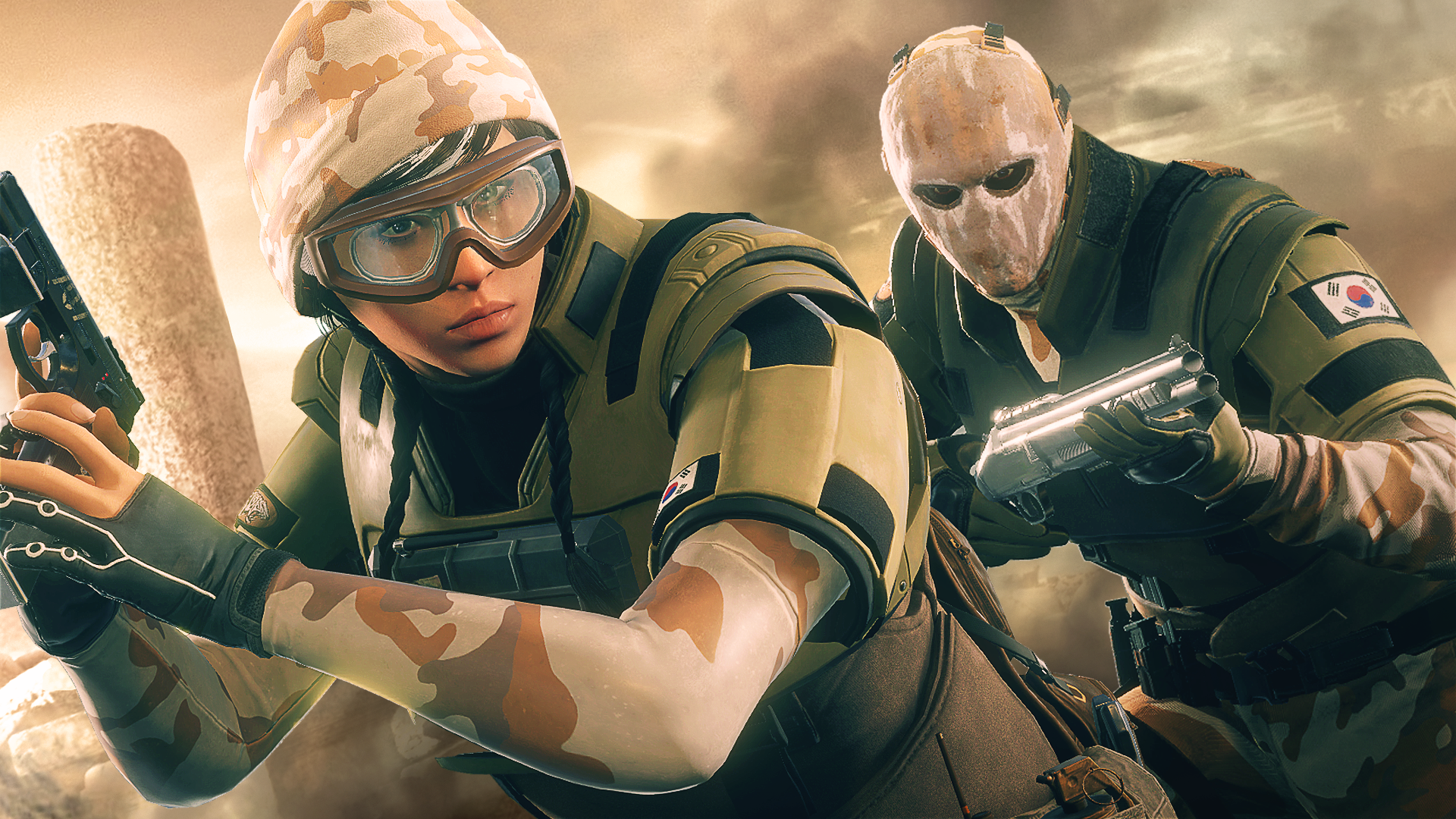 Visual created to display the items and skins for the 707 operators (Dokkaebi and Vigil). I was responsible for the lighting, posing, design and composition of the visual. 3D assets provided by R6 Production.
