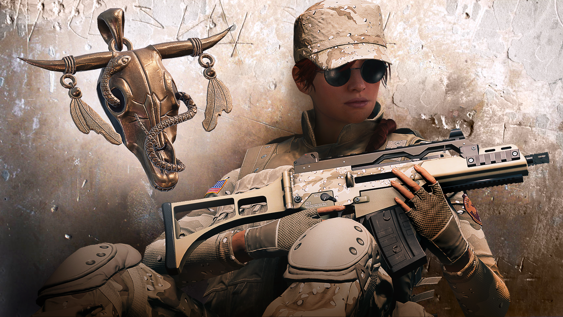Visual created to display the items and skins for the operator Ash. I was responsible for the lighting, posing, design and composition of the visual. 3D assets provided by R6 Production.