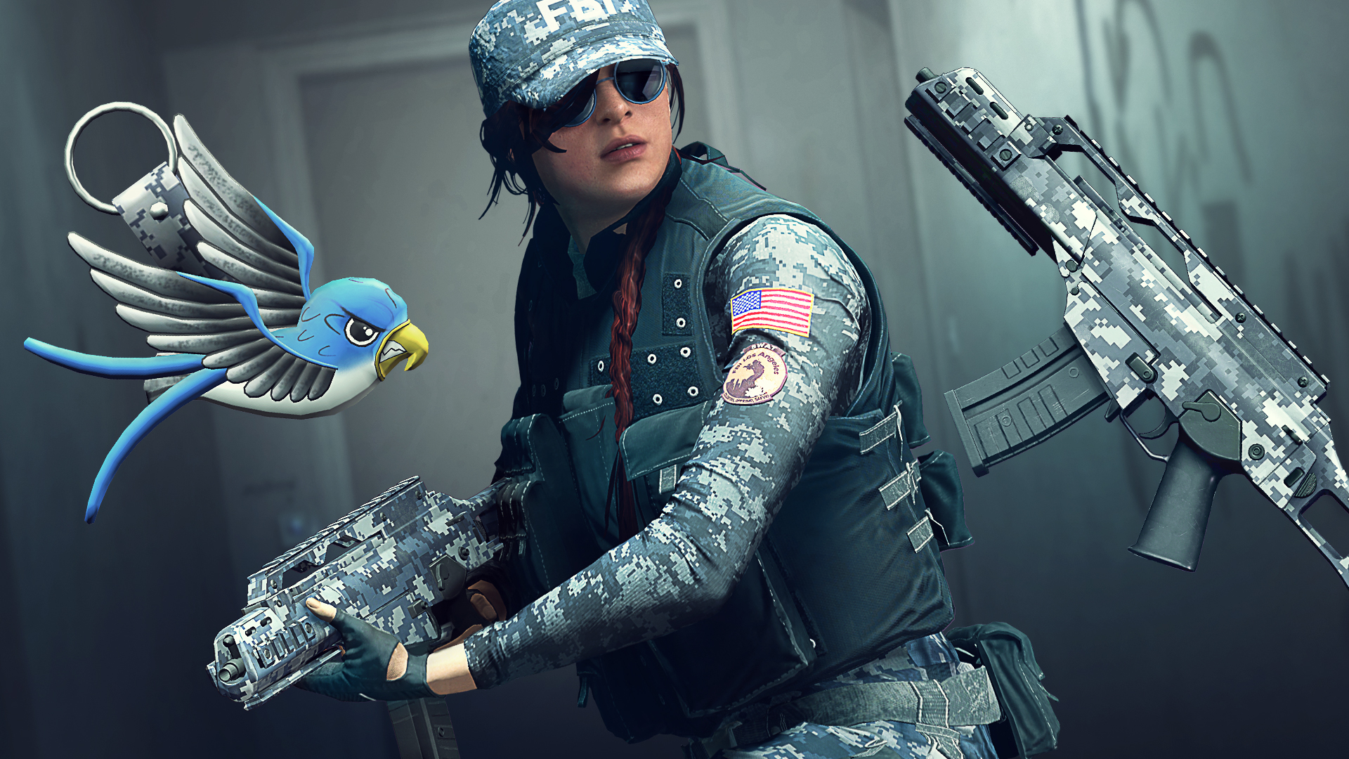 Visual created to display the items and skins for the operator Ash. I was responsible for the lighting, posing, design and composition of the visual. 3D assets provided by R6 Production.