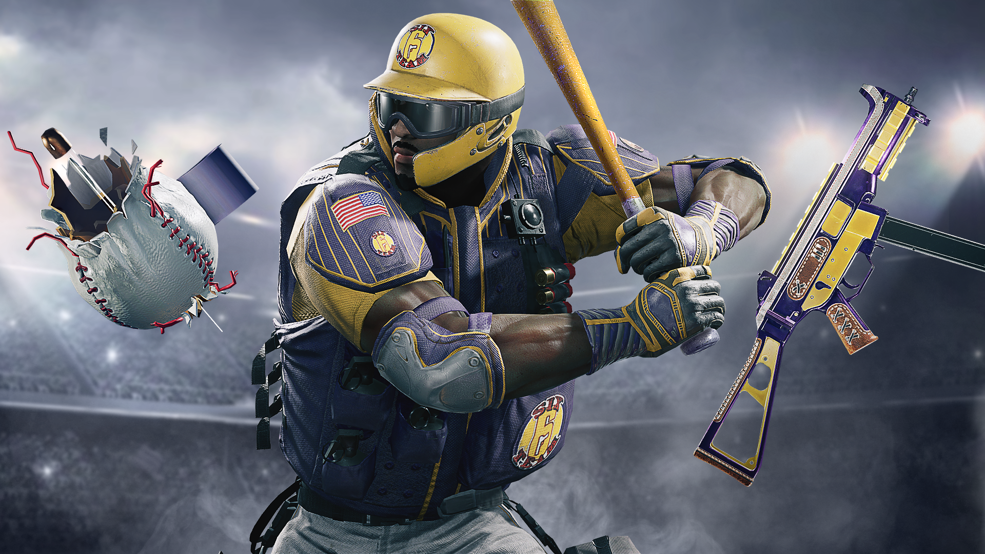 Visual created to display the items and skins for the operator Castle (with a baseball theme). I was responsible for the lighting, posing, design and composition of the visual. 3D assets provided by R6 Production.