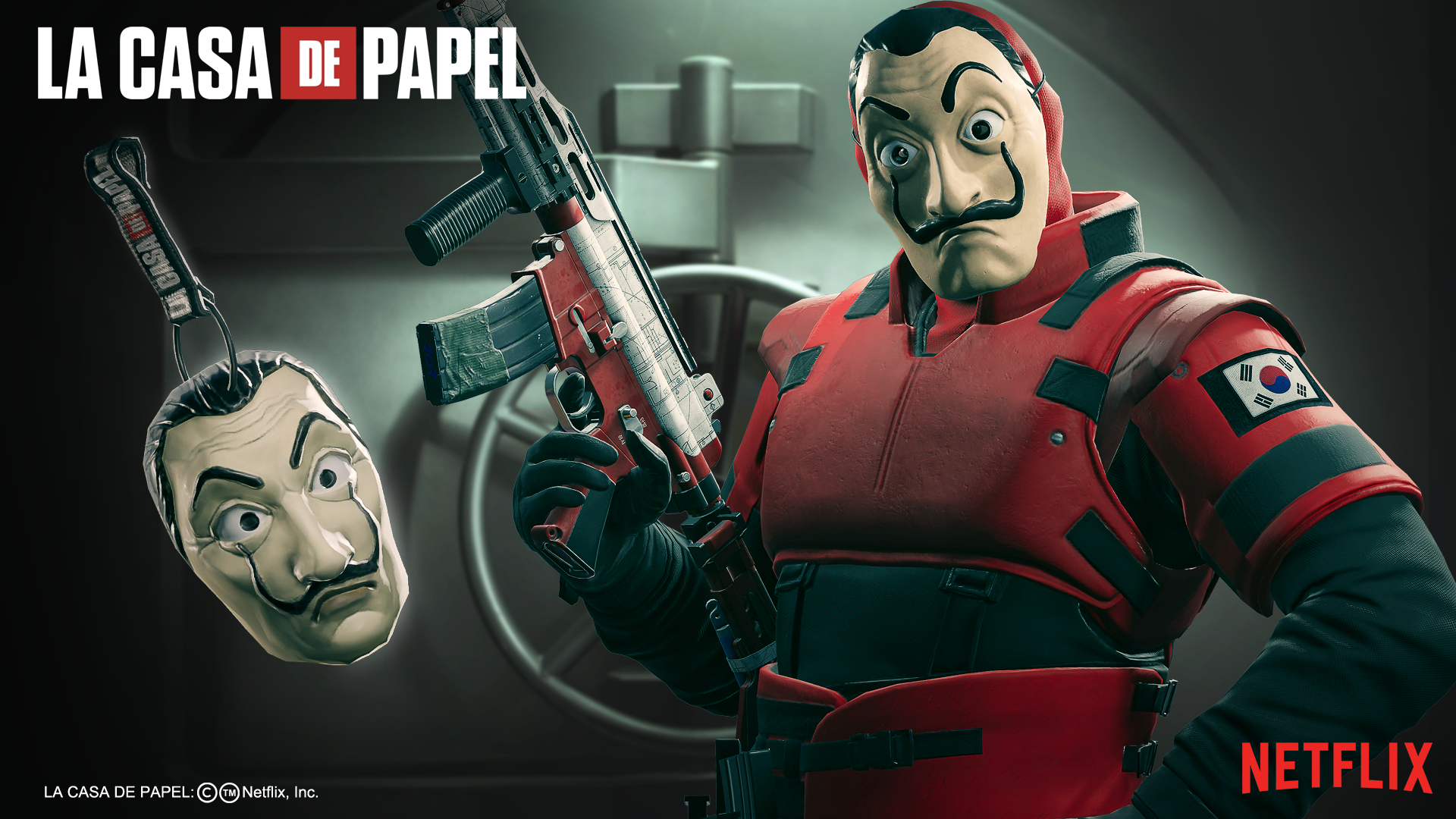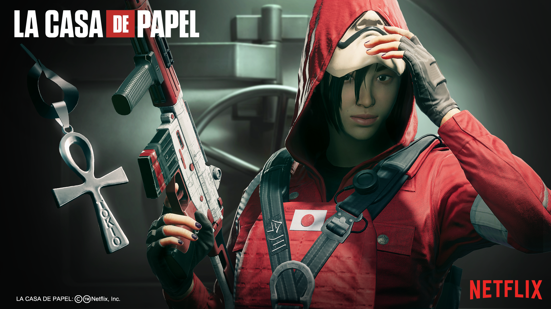 Visual created to display the items and skins for the Hibana and Vigil based on the Netflix show, La Casa de Papel. I was responsible for the lighting, posing, design and composition of the visual. 3D assets provided by R6 Production.
