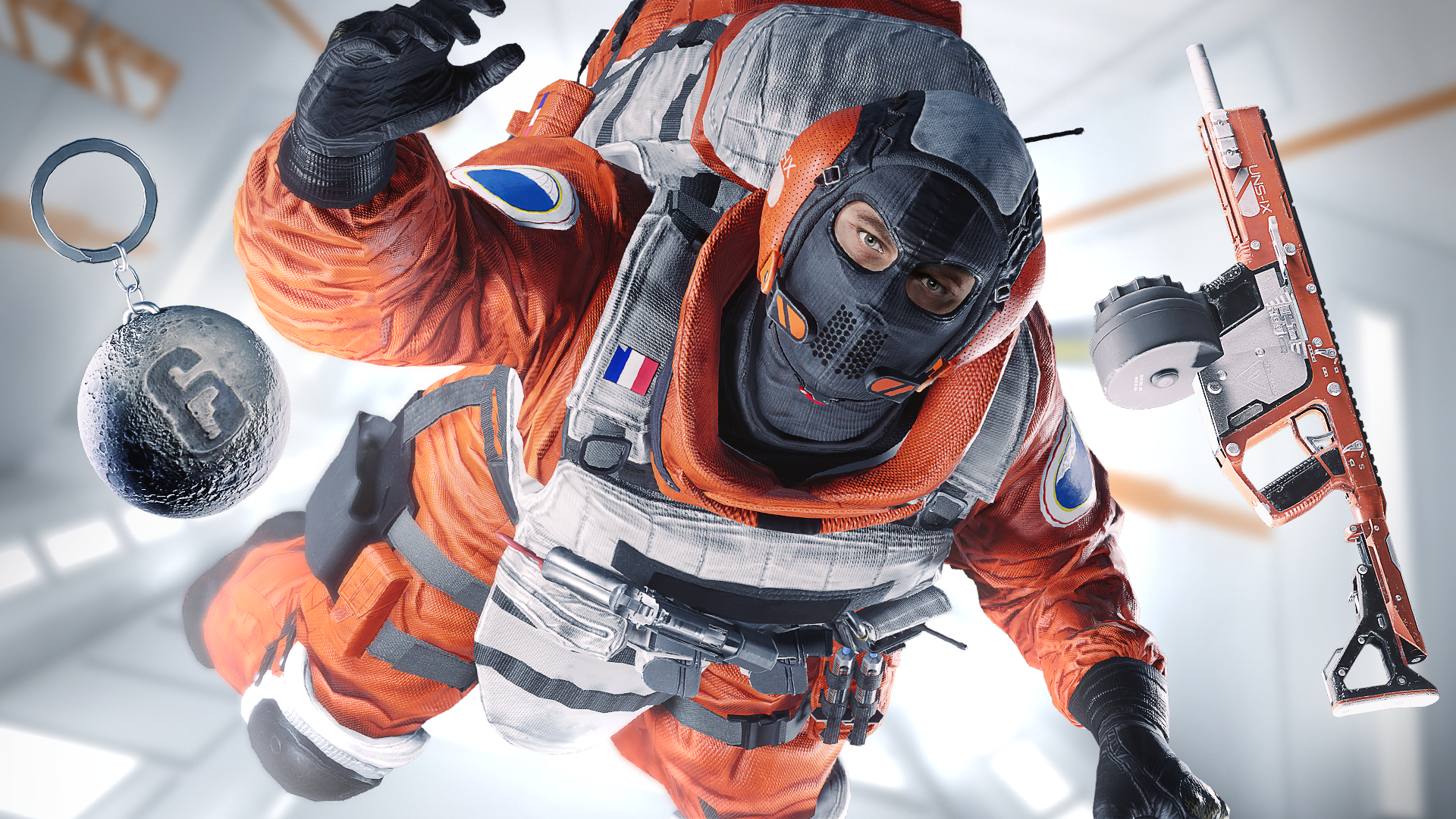 Visual created to display the items and skins for the operator Lion (with an astronaut theme). I was responsible for the lighting, posing, design and composition of the visual. 3D assets provided by R6 Production.